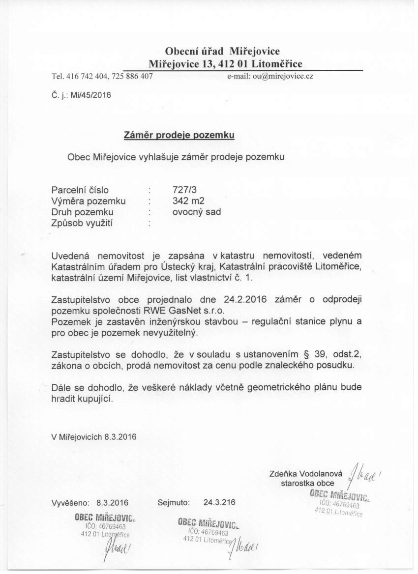 Záměr prodeje pozemku ve vlastnictví obce Miřejovice společnosti RWE GasNet s.r.o.